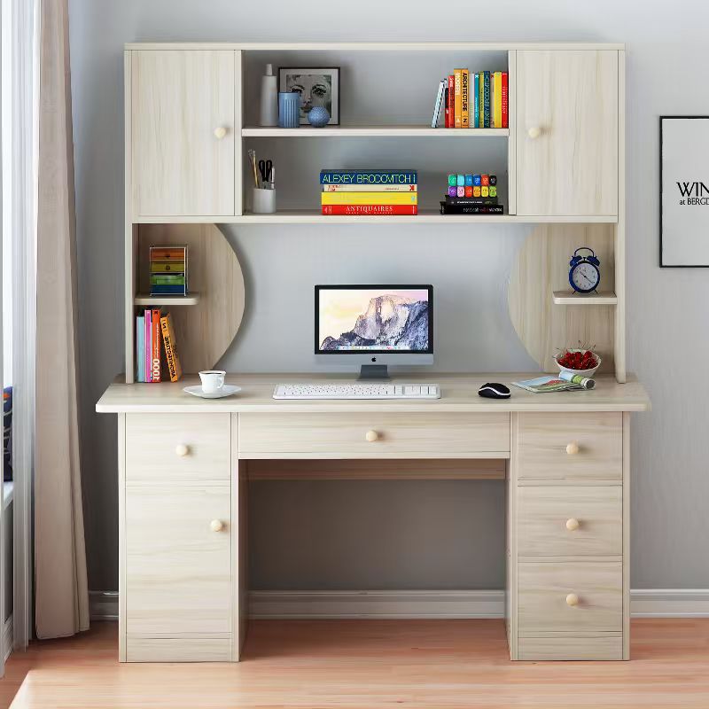 分層收納系統:上層開放式格架可陳列書籍、裝飾畫,兩側封閉柜能收納文具、資料;中層圓弧置物區方便隨手取放常用物品;下層抽屜與柜體滿足隱私物品、大件文具的收納需求,讓桌面永遠整潔有序。
