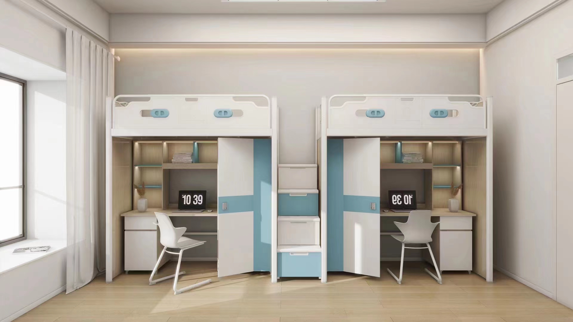 雙層宿舍鐵床 :一般尺寸為200cm*90cm,適合兩人同時(shí)使用,層高一般為1.5m至2m之間